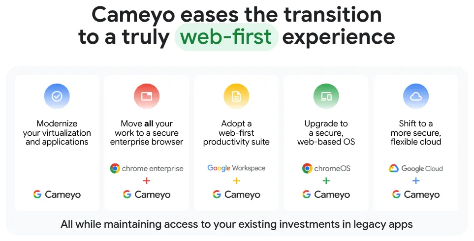 11月12日,Google宣布重磅推出新版虚拟应用程序交付(VAD)服务“Cameyo by Google”。该服务基于去年Google收购的软件虚拟化公司 Cameyo,通过虚拟化技术让企业用户可以在 Chromebook 上运行原本基于 Windows 的应用,实现从 Windows 到 ChromeOS 的平滑转型。