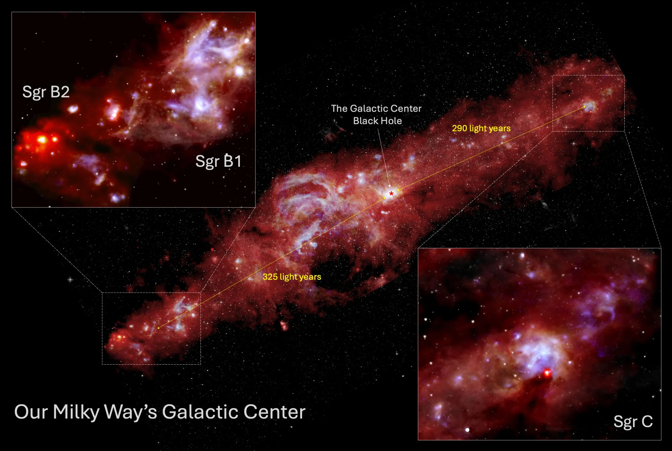 详细的红外成像表明,银河系中心的Sgr B1、Sgr B2和Sgr C距离银河核心仅约300光年,而我们的太阳距离银河中心约26000光年。这些红外影像不仅捕捉到了正在形成的大质量恒星,还记录了围绕银河超大质量黑洞的冷尘与气体的辐射。