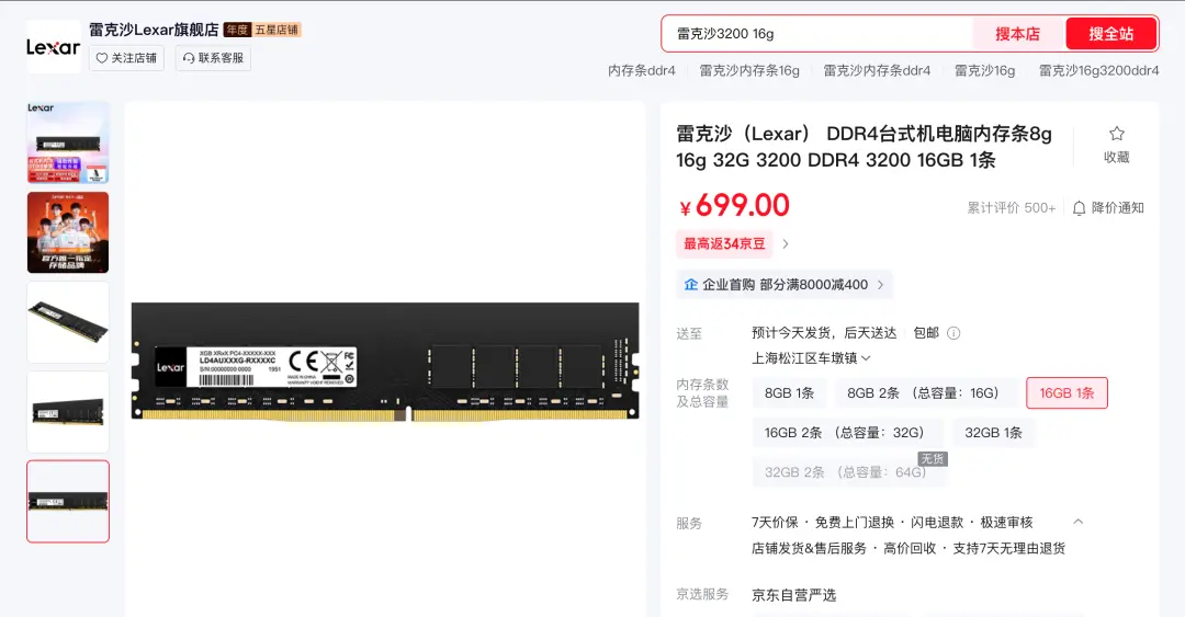 据《金融投资报》11月6日报道,在成都一家数码超市内,多家电脑装配商家表示,今年以来,内存条等产品的价格波动极大,此前200多元即可买到的16GB DDR4内存条,现在要卖到400多元。而在电商平台上,去年售价仅179元的同款雷克沙DDR4 16GB内存条,其官方旗舰店售价已飙至699元,一年多时间涨幅超三倍。