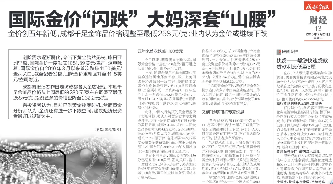 然而,在“中国大妈”集体抄底之后,金价并未如预期反弹,而是继续下跌,最低一度跌至1049美元/盎司。抄底的大妈们不但被“闪了腰”,而且从2013年到2019年长期被套牢。