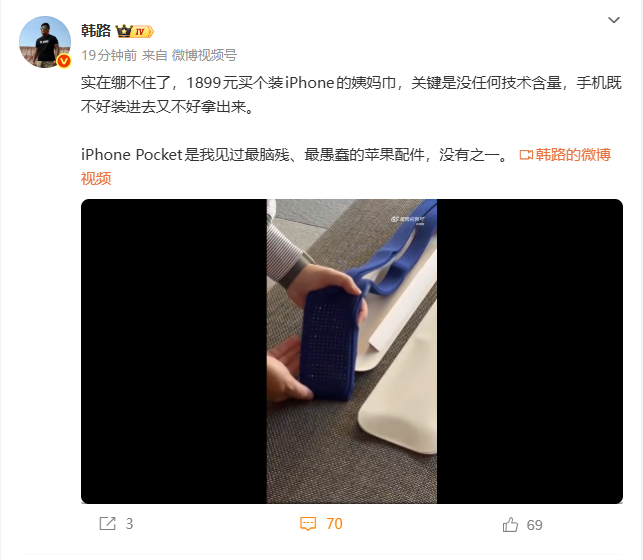 韩路犀利点评:“1899元买个装iPhone的姨妈巾,关键是没任何技术含量,手机既不好装进去又不好拿出来。”