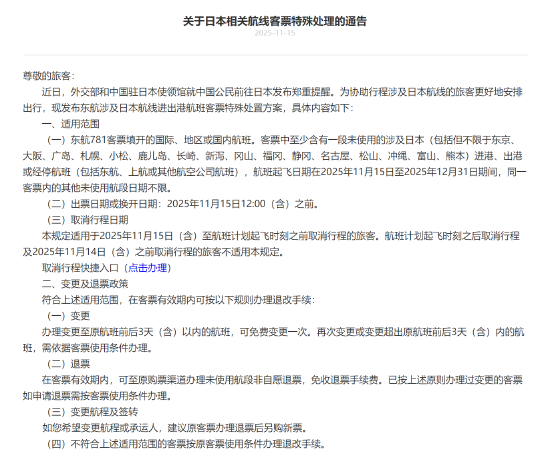 东航表示,今年11月15日12:00(含)前购买或换开的东航781客票填开的国际、地区或国内航班。客票中至少含有一段未使用的涉及日本(包括但不限于东京、大阪、广岛、札幌、小松、鹿儿岛、长崎、新泻、冈山、福冈、静冈、名古屋、松山、冲绳、富山、熊本)进港、出港或经停航班(包括东航、上航或其他航空公司航班),航班起飞日期在2025年11月15日至2025年12月31日期间,同一客票内的其他未使用航段日期不限,办理变更至原航班前后3天(含)以内的航班,可免费变更一次。再次变更或变更超出原航班前后3天(含)内的航班,需依据客票使用条件办理。在客票有效期内,可至原购票渠道办理未使用航段非自愿退票,免收退票手续费。