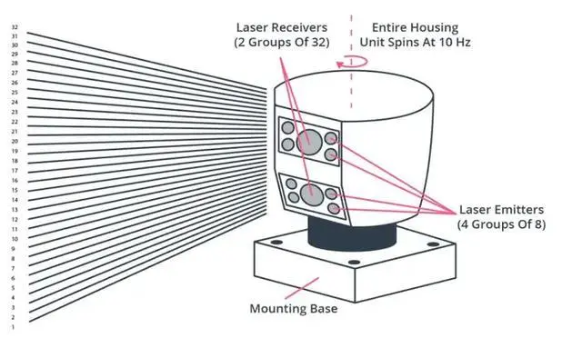 比如最早的机械式激光雷达,也就是转圈圈的那种,就可能会同时发射出 32 条激光线束探测环境,那这就是一个 32 线的激光雷达。