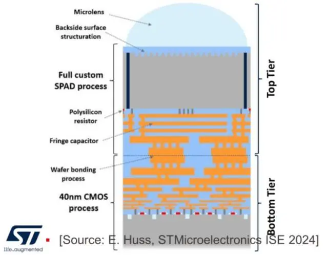 巧的是,这种方案的核心: SPAD-SoC 芯片的构造也几乎和相机上的 CMOS 一模一样,都需要用 3D 堆叠的方式制造。