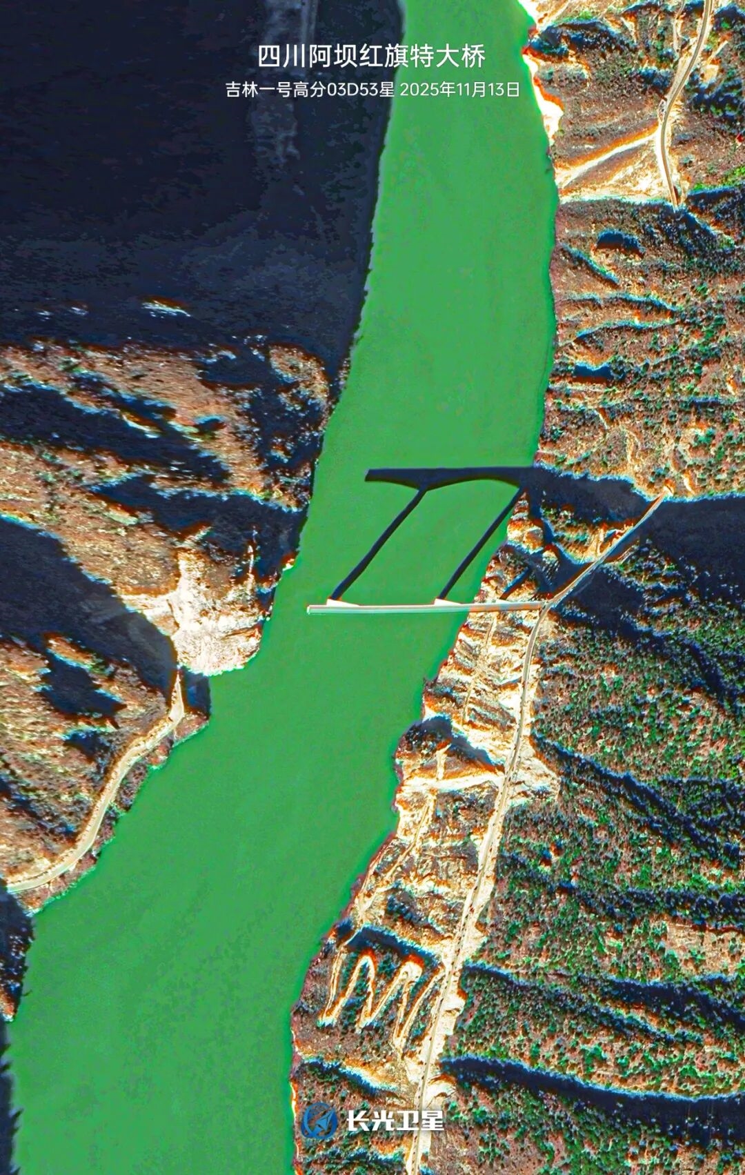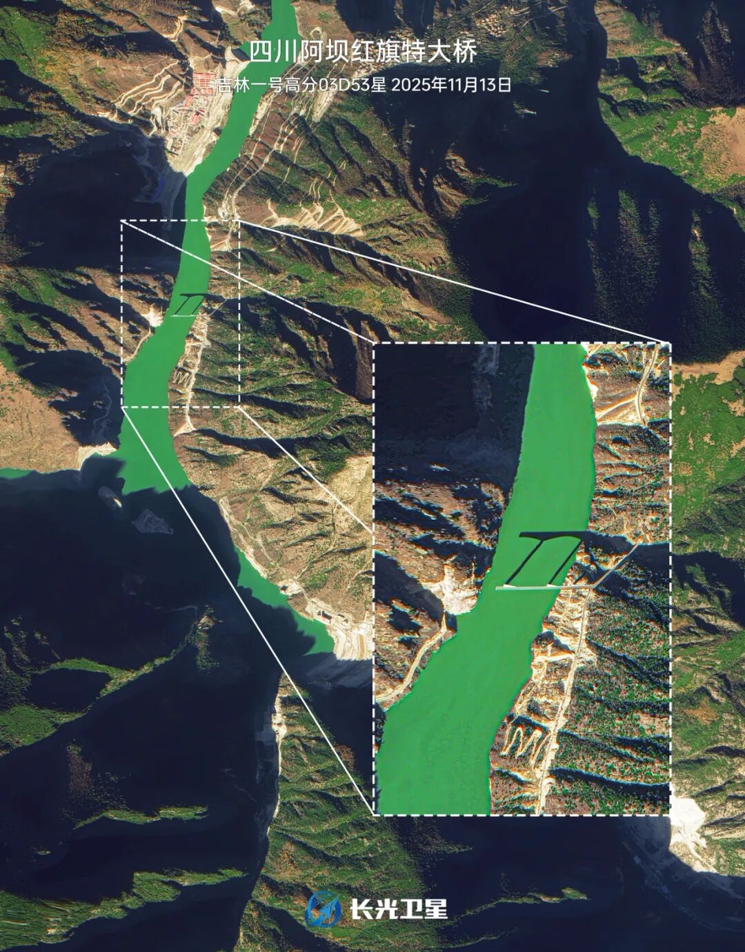 近日,四川省阿坝州马尔康市境内的红旗特大桥引桥垮塌,引发广泛关注。吉林一号高分03D53星在过境四川阿坝期间,特意拍摄了一组高清图像,清晰记录下了大桥垮塌后的现场。