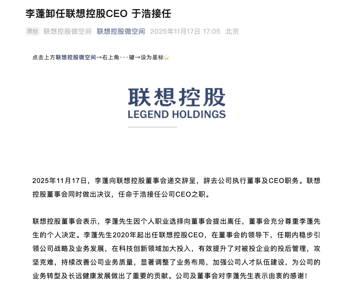 11月17日,联想控股股份有限公司宣布,李蓬因其个人职业选择,辞任公司执行董事及首席执行官(CEO)职务,并不再担任公司环境、社会及治理委员会及战略委员会成员,自2025年11月17日起生效。