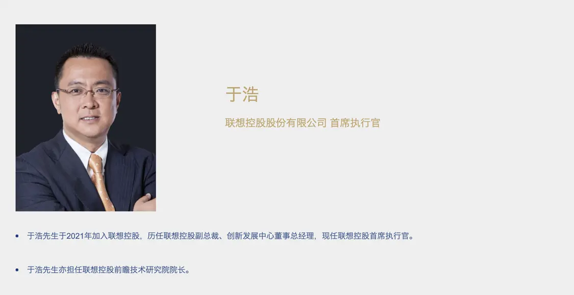 公司官网显示,于浩先生于2021年加入联想控股,历任联想控股副总裁、创新发展中心董事总经理,现任联想控股首席执行官。同时担任联想控股前瞻技术研究院院长。