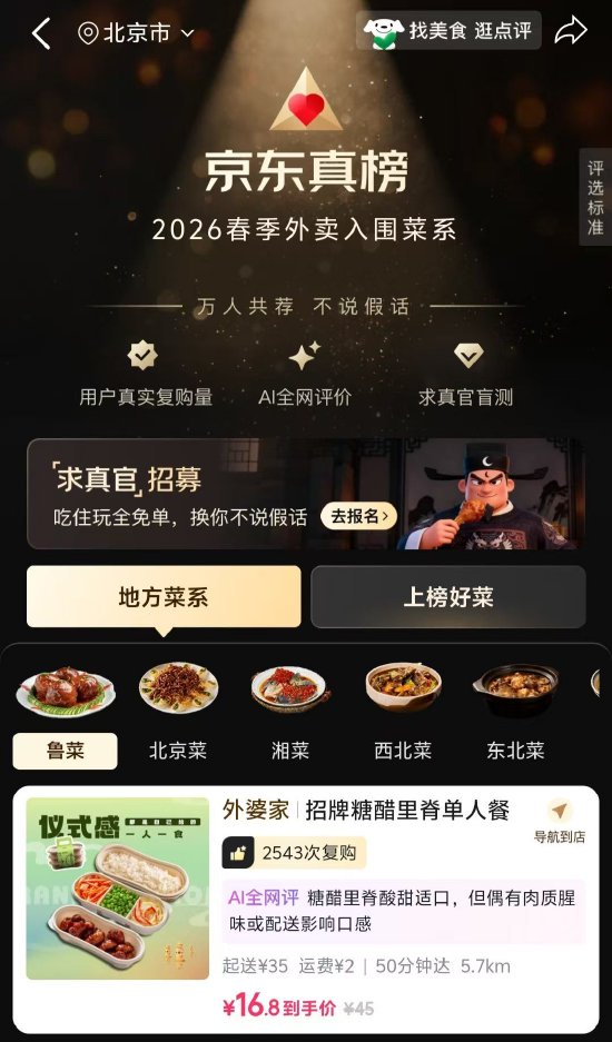 在“京东真榜”频道内,主要设有“地方菜系”与“上榜好菜”两大板块。其中,“地方菜系”覆盖了鲁菜、北京菜、湘菜、西北菜、东北菜等多个地域风味,系统会基于所选菜系智能推荐相应外卖菜品。每个推荐菜品均附带复购次数、AI全网评价、起送费用、配送距离、到手价等关键信息,并支持用户一键导航至对应门店。而在“上榜好菜”部分,则围绕具体人气单品进行组织,例如炸酱面、地三鲜、把子肉、口水鸡、烤冷面等,方便用户根据具体餐品快速选择。