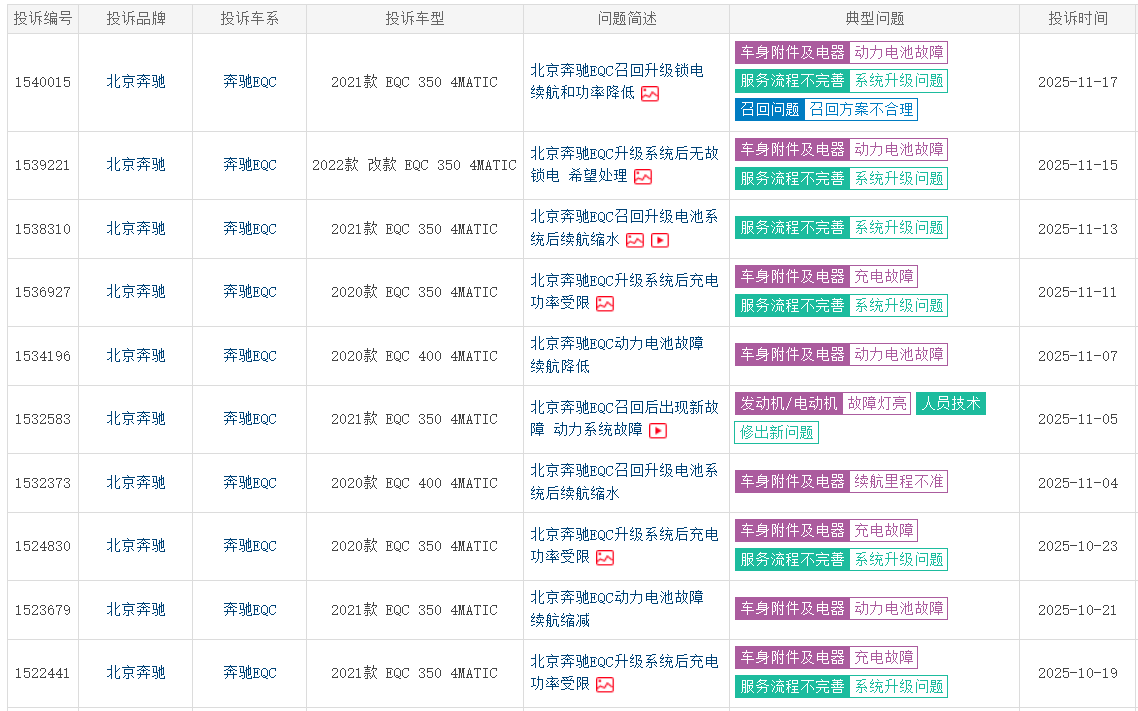 还有投诉车主表示,奔驰EQC因电池与电控存在先天性硬件设计缺陷,启动召回并升级电池质管理系统时,未提前如实告知车主核心影响。