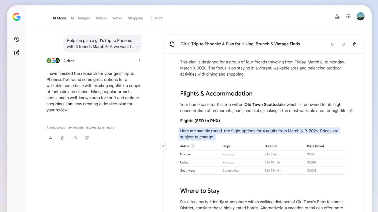 谷歌在一篇博客文章中解释道:“选择后,‘画布’侧边栏会立即生成一份旅行计划,其中整合了航班和酒店的实时搜索数据、谷歌地图中的详细信息(如照片和评价),以及来自全球各类网站的相关内容。你会看到符合个人需求的推荐,例如基于价格和设施的酒店对比,或是根据住宿地点的出行时间优化后的餐厅及活动建议。”