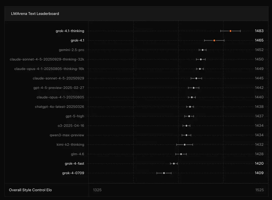 就在这样一个竞争最激烈的公开擂台上,xAI 的 Grok 4.1 系列拿下了极具含金量的一次 “双冠”:Grok 4.1 Thinking 版以 1483 Elo 拿下冠军,而非推理版 Grok 4.1 也以 1465 Elo 获得亚军。