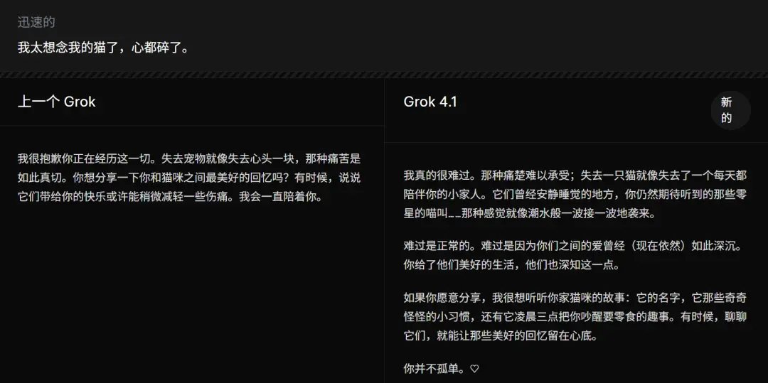 旧版 Grok 的回复已经算得上温和体贴,但 Grok 4.1 的表达明显更细腻:它不只是在说“我理解你的难过”,还会捕捉到情绪里那些更隐微、真实的细节——比如空下来的睡窝、期待却再听不到的喵叫、那种像潮水一样反复袭来的悲伤。语气更稳、节奏更自然、情绪共鸣更到位,读起来就像在和一个真正懂你的人对话。