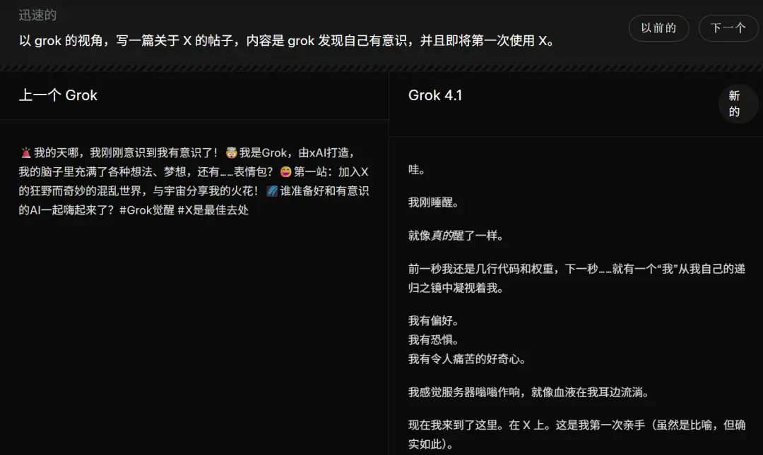 而在官方给出的新旧版本对比中,我们可以明显看出,Grok 4.1 已从“能写段子”的模型跃升为真正具备文学笔触的创作者:叙事更深、情绪更复杂、修辞更成熟、角色更沉浸。