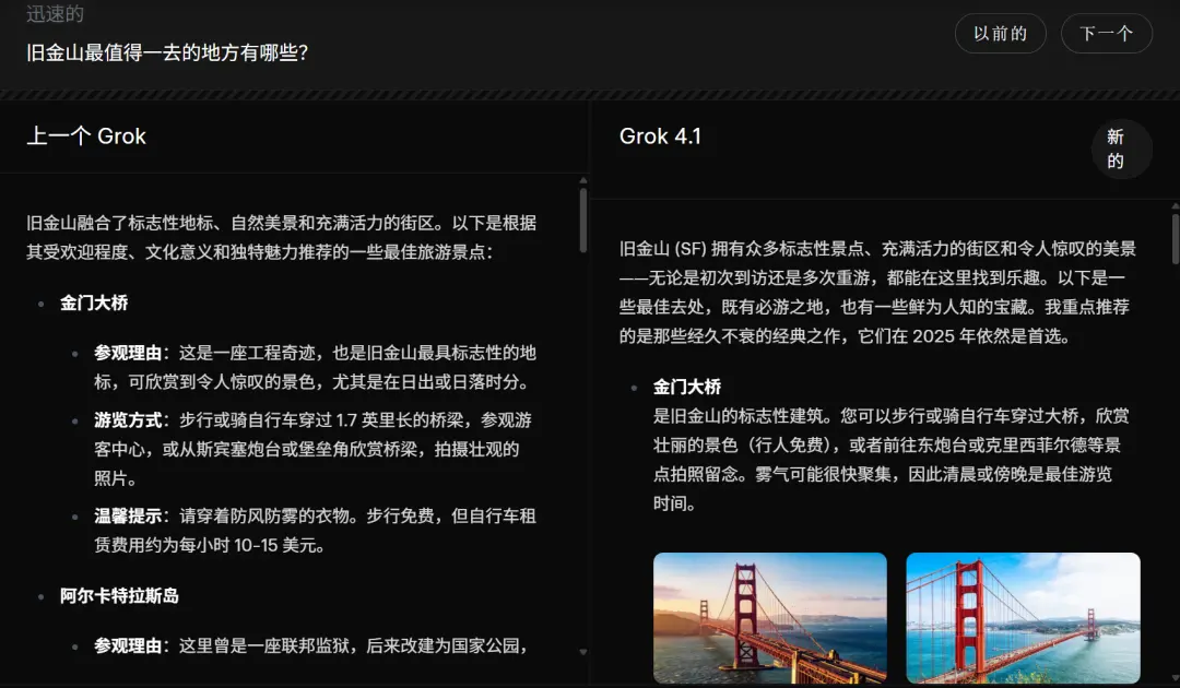 一个直观的例子是官方展示的旅游攻略对比。旧版 Grok 给出的内容像“百科式景点总览”,信息密度高但缺乏节奏感;而 Grok 4.1 写旧金山,则像一位真正“去过”“懂氛围”的本地向导,会主动提示拍照时间、推荐适合你的路线,甚至带出城市的具体气质,更像在和一个真实的人交流。