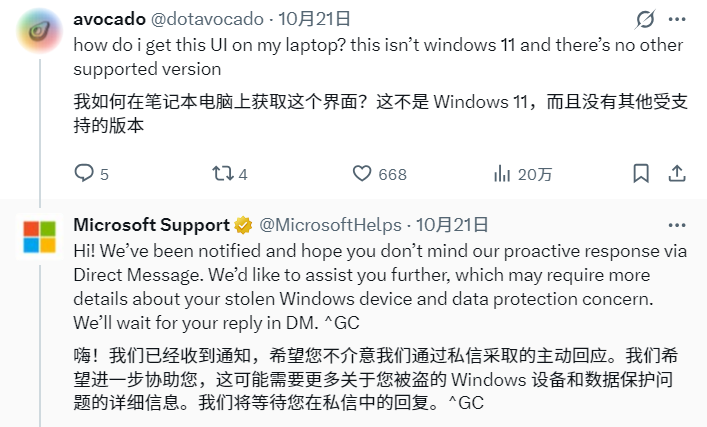一条热门评论问道:“我如何才能在我的笔记本电脑上获得这个UI?这不是Windows 11,也没有其他受支持的版本了。”