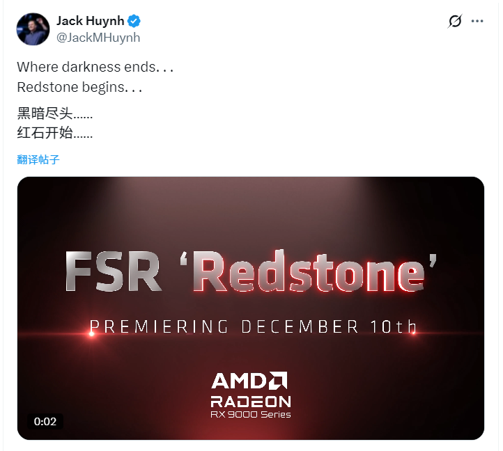 AMD官宣:FSR Redstone重磅升级12月10日发布