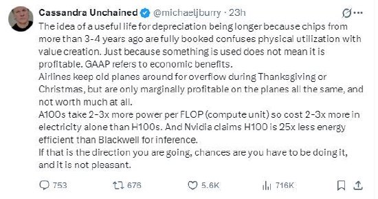 他说,从会计角度来看,英伟达的客户仍在使用旧芯片并不意味着它们的“使用寿命”更长,因为这“混淆了物理利用与价值创造”。