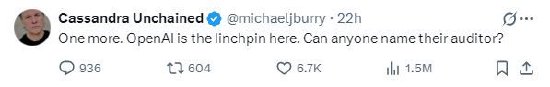 伯里最后以一个简单的问题结束了他的一连串帖子:“再问一遍。OpenAI是这里的关键。谁能说出他们的审计师的名字?”