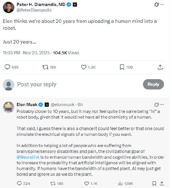 一位X用户周四发帖称:“埃隆认为我们可能再过20年就能将人类的思想上传到机器人。仅仅20年……”