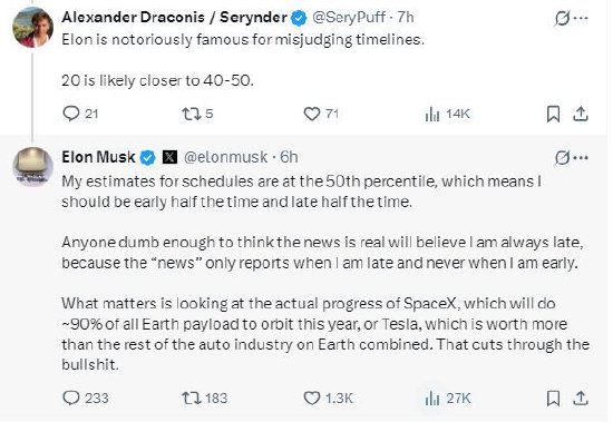 马斯克回应称:“我对时间表的估计是在第50百分位,这意味着我应该有一半时间早到,一半时间晚到。