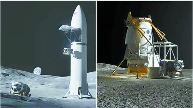SpaceX(左)和蓝色起源(右)分别提出的月球着陆器设计。