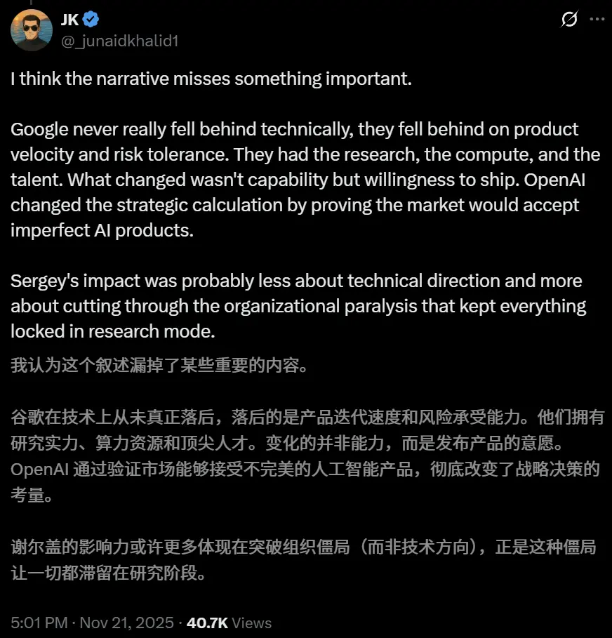 布林的存在直接催化了Gemini 3项目的加速,他专注于解决模型在长逻辑链推理上的“长尾问题”,这是之前职业经理人们因追求短期指标而忽视的领域。