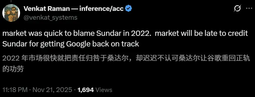 正如很多人在3年前将Google的落后归咎于劈柴,却不敢承认,正是劈柴让Google重回正轨,并完成对OpenAI的超越。
