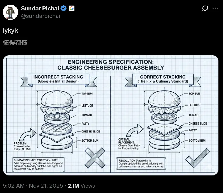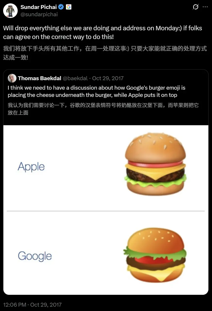 2017年,Google的汉堡emoji把奶酪放在肉饼下面,瞬间全网炸锅。这直接引发了一场又好笑又撕裂的互联网大战,大家疯狂争论“正确”的汉堡该怎么叠。