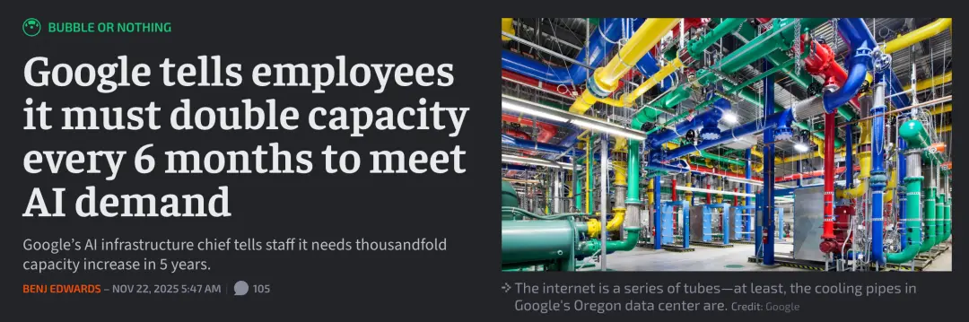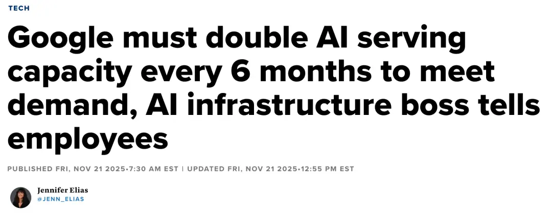 本月早些时候的全体员工大会上,GoogleAI基础设施负责人Amin Vahdat直接说:公司必须每六个月就把服务容量翻一倍,才能满足人工智能服务的需求。