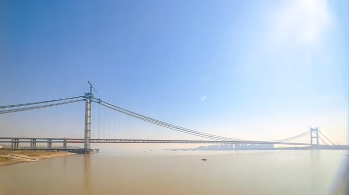 因受鄂州花湖机场航空限高与长江通航需求双重制约,主塔高度仅184米,垂跨比达1:15(千米级悬索桥中首次)。