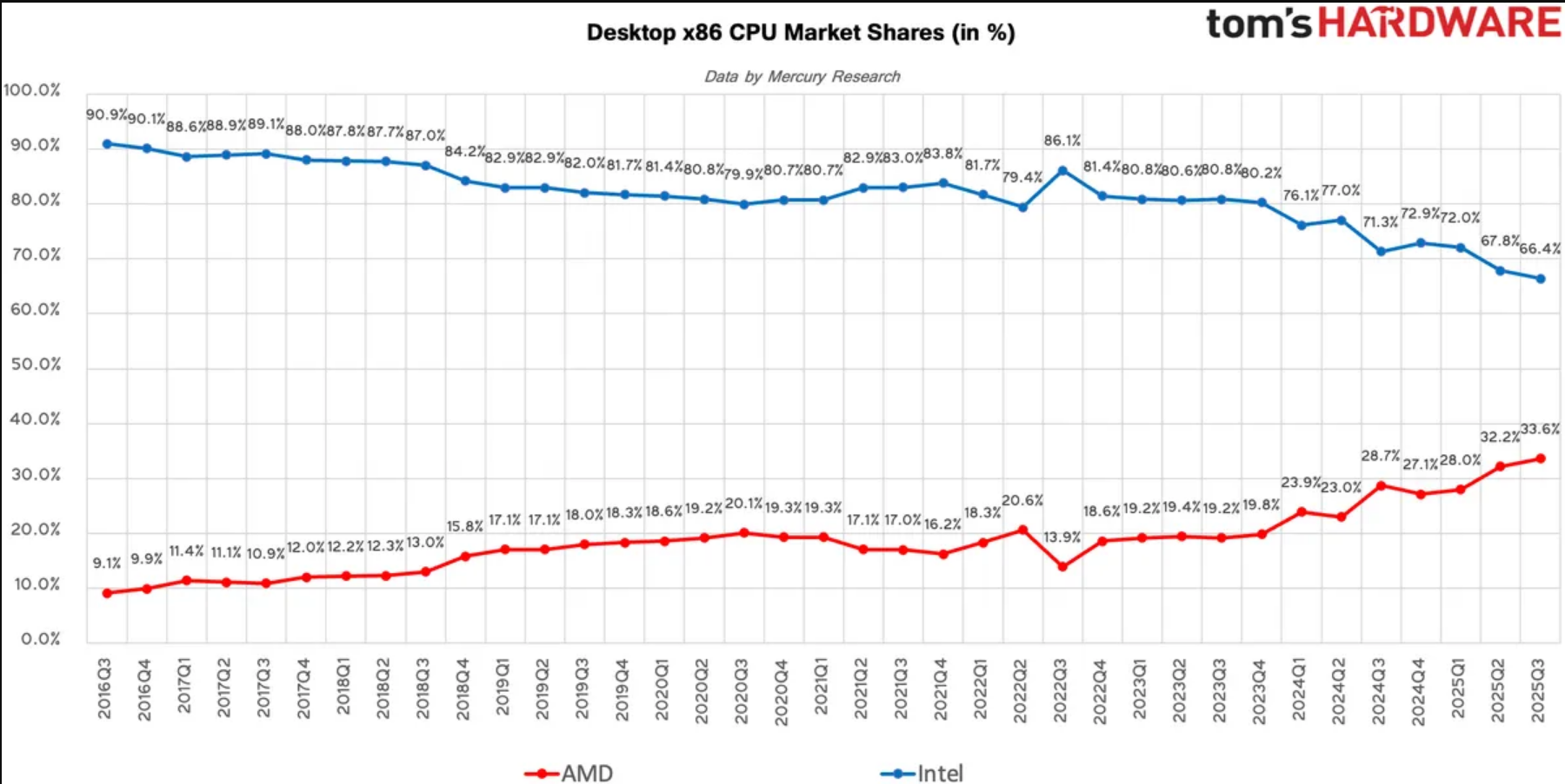 不过苏姿丰所说的份额超40%不确定具体是那部分,调研公司Mercury公布的Q3季度数据来看,Intel依然占据整体2/3的x86市场份额,AMD拿下了1/3的份额。