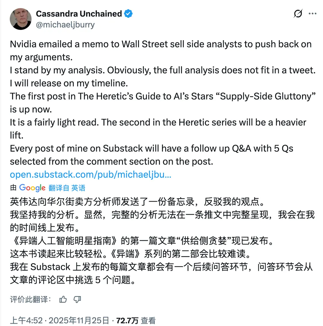 上周日,他新开设了Substack专栏“解缚的卡珊德拉”(Cassandra Unchained),在首篇文章中继续对英伟达提出批评。他在周一的X帖子里承认英伟达已通过分析师书面说明对其论点作出回应,但他强调:“我坚持自己的分析结论。完整的分析显然无法通过单条推文呈现,我将按照自己的时间安排发布完整报告。”