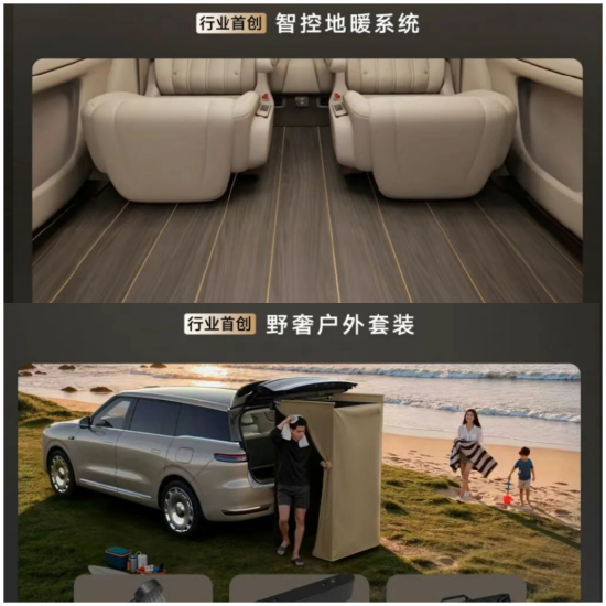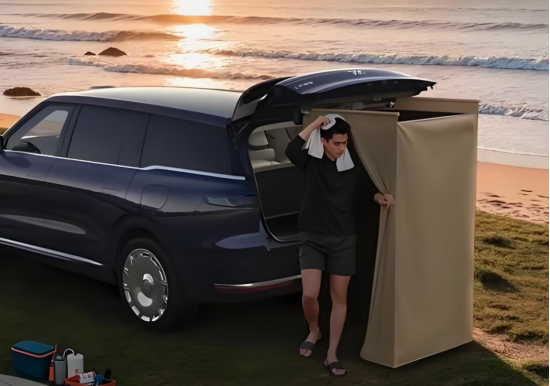 首先是地暖系统,根据官方介绍,该车搭载了行业首创智控地暖系统,地板内嵌石墨烯加热,能够均匀发热,宣称光脚上车也不冷;其次是洗澡功能,智己LS9在选装野奢户外套件后,可以提供一个可以悬挂于尾门之上的“单人简易淋浴房”,通过后备厢下沉空间内的10升水箱供水,接通车辆电源后,加热模块可以在10分钟内将水温升至45℃。