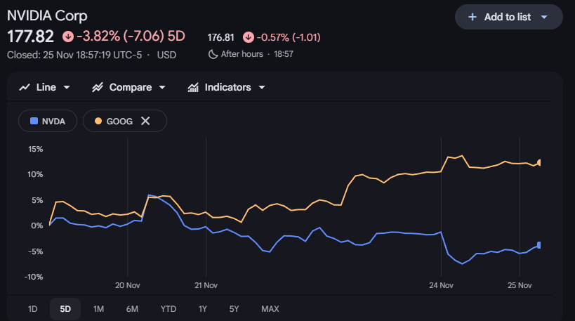 (英伟达VS谷歌过去五日走势对比)