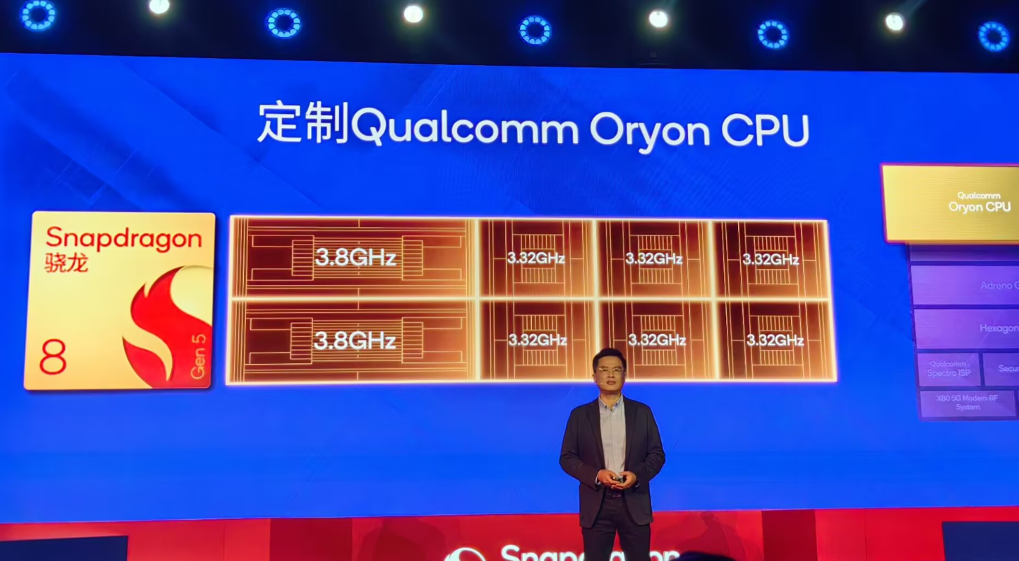 今天下午,高通正式发布了第五代骁龙8,搭载定制的Qualcomm Oryon CPU,最高主频高达3.8GHz。采用全大核的2+6架构,2个超大核最高主频3.8GHz,6个性能核心最高主频3.32Ghz。