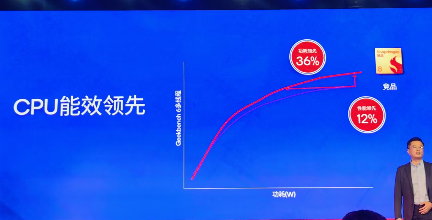 对比第三代骁龙8,CPU单线程提升35%,多线程提升36%,功耗领先42%。