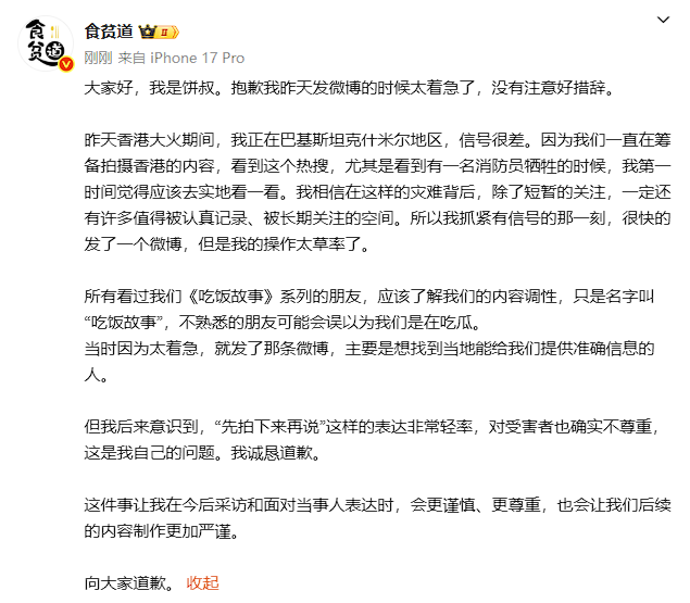 刚刚,知名网红博主“食贫道”发布致歉声明。昨日下午,香港大埔宏福苑发生五级火警,官方最新数据显示,目前已造成44人遇难,仍有非常多的人失联。