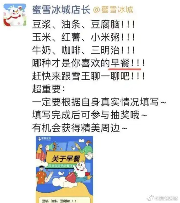 继涉足啤酒市场后,蜜雪冰城又开始布局早餐了。近日,蜜雪冰城企业号发布了一条消息,让大家聊一聊“哪个是你最喜欢的早餐!”该海报上有豆浆、油条、豆腐脑;玉米、红薯、小米粥,甚至还有牛奶、咖啡、三明治。