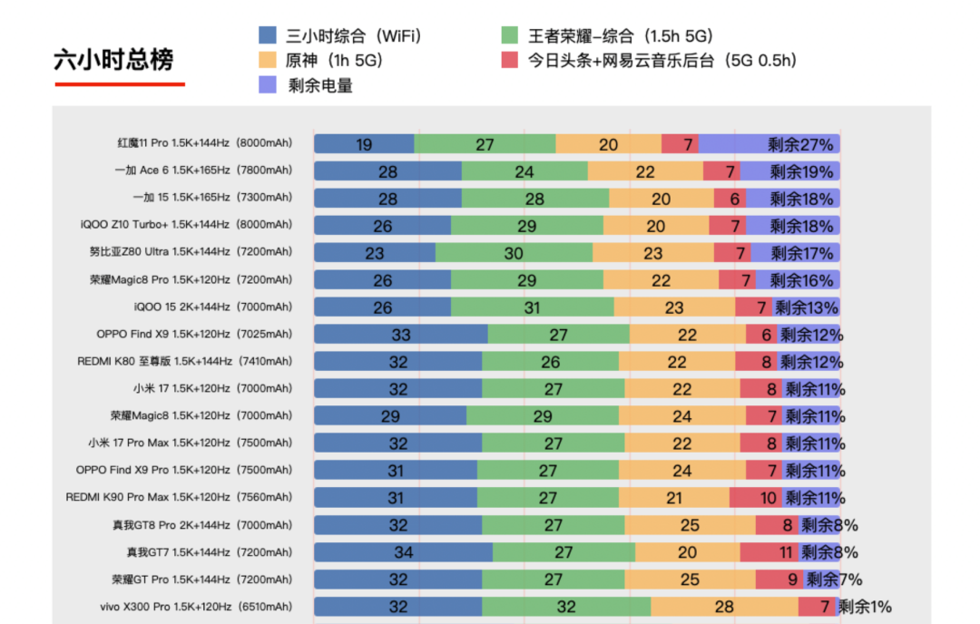大伙儿看看现在各大评测的续航排行榜就知道了,你会发现前面清一色都是大电池国产机在 “ 屠榜 ”,苹果三星早就被甩出了第一梯队 —— 参数不会骗人,续航成绩更不会。