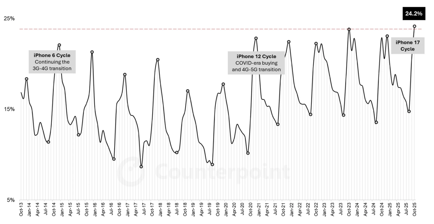 Counterpoint高级分析师Ivan Lam指出,除了产品力本身,特殊的市场节点也助推了这一增长:新冠时期的换机潮达到顶峰,加上“双 11”大促提前开启,以及中秋国庆假期的销售热度延续到了10月。当然,iPhone Air的销售就暗淡了很多,跟iPhone 17系列相比,完全不值得一提。