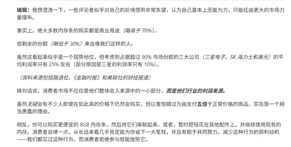 简单来说,他认为内存的涨价是“人为故意”,因为新冠疫情后的经济放缓导致产品相对于需求过剩,所以他们刻意减少了产量。
