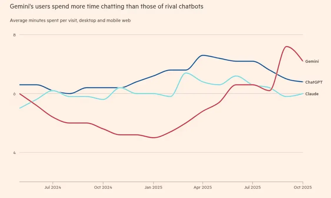根据网站分析公司Similarweb的数据,OpenAI每周拥有超过8亿用户,在整体聊天机器人使用方面仍占据绝对主导地位,但如今用户花在Gemini上的聊天时间已经超过了ChatGPT。