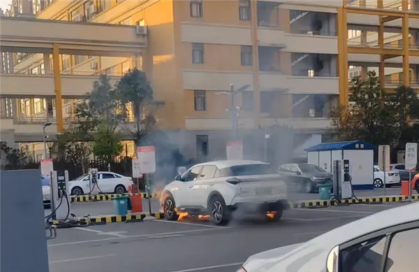 哪吒U停车场充电起火自燃 底盘电池往外狂喷火