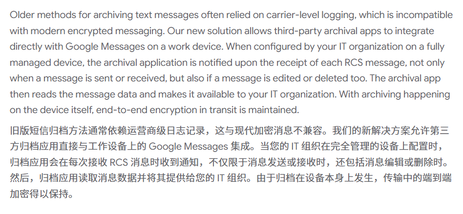 在近日的更新中,Google宣布将在今年正式推出一项针对Android Enterprise的RCS信息存档功能。这项功能将允许企业IT组织在其完全管理的Android工作设备上,访问并监控员工的RCS、SMS(短信)和MMS(彩信)消息记录。