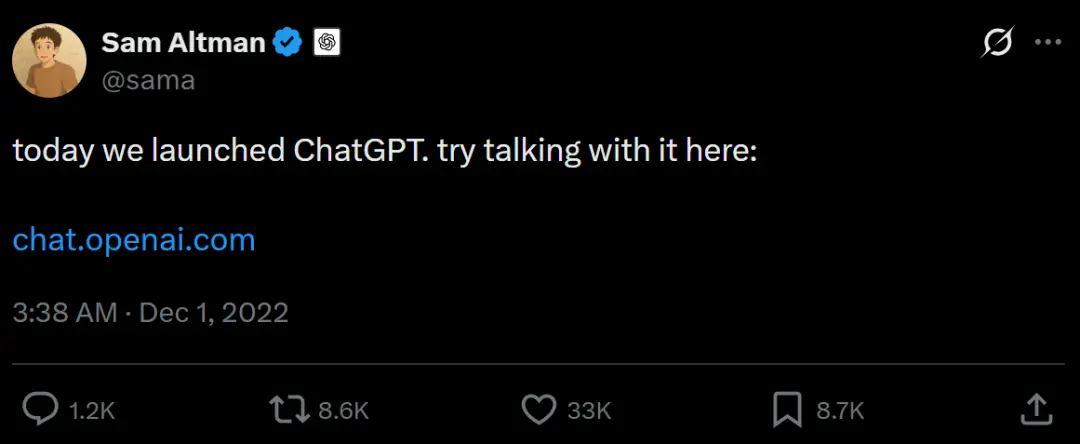 如果将时间拨回三年前的今天,也就是2022年12月1日,那是一个相对安静的周三。位于旧金山的一家名为OpenAI的非营利实验室,悄无声息地发布了一个名为“ChatGPT”的研究预览版。