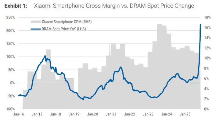报告指出,通过回溯“2016-17年、2019-21年以及2022-23年的周期”,数据清晰地显示了一个非共识的发现:“当DRAM价格变化呈现上升曲线时,小米的智能手机毛利率实际上有所改善。”这表明,历史经验并不支持“成本涨=利润降”的简单公式。