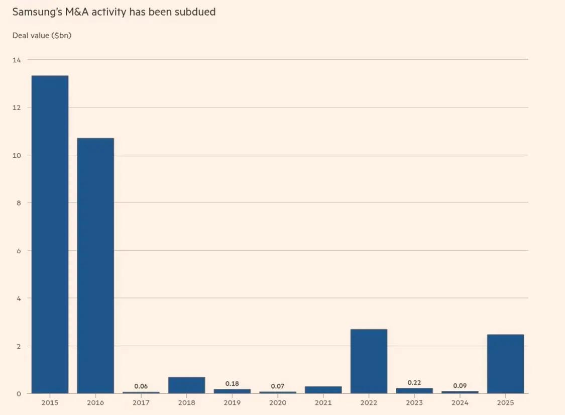 然而,自这之后,三星再未完成过同等规模的交易。过去一年,三星完成了六项收购,包括以15亿欧元收购德国数据中心冷却公司FläktGroup的交易。此外,三星还收购了美国数字医疗公司Xealth、法国医疗科技集团Sonio SAS、美国AI开发商Oxford Semantic Technologies以及韩国机器人公司Rainbow Robotics。