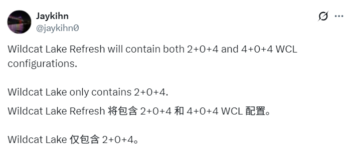 Jaykihn爆料称,Wildcat Lake的Refresh版本将迎来配置升级,在原本2P+0E+4LP的6核心配置上,新增一种4P+0E+4LP的配置,将总CPU核心数提升至8核: