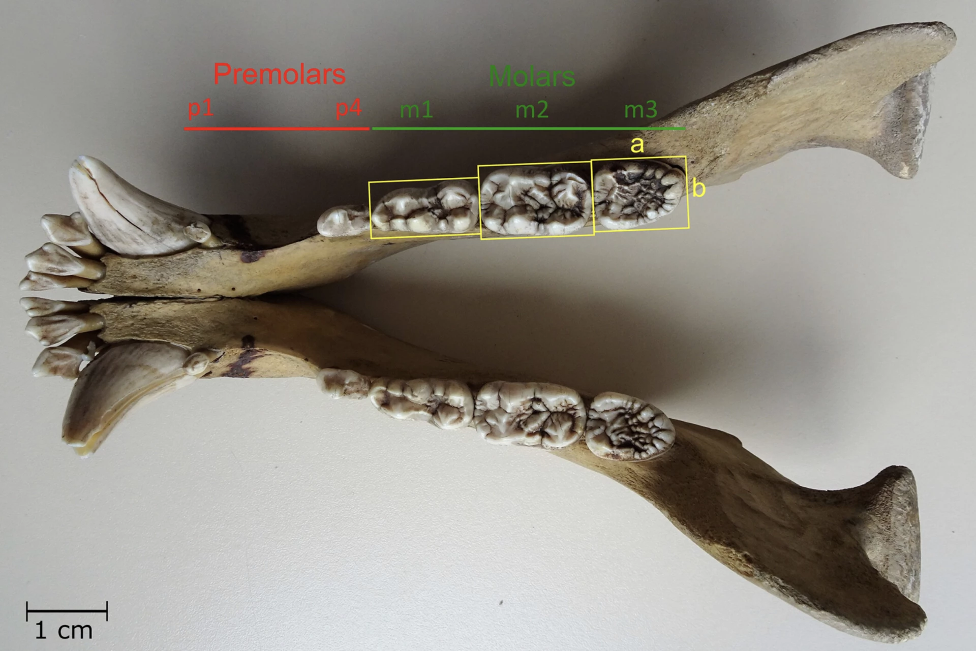 第二次“破例”发生在大约125万至70万年前的早—中更新世过渡期,当时欧洲草原继续扩张、气候持续转冷,与洞熊祖先Ursus deningeri的出现紧密重合。这一时期的熊类进一步向草食方向偏移,研究显示,臼齿发育的程序再次被调整:这一次是第二臼齿(m2)的抑制信号被削弱,于是第三臼齿(m3)得以扩大,增加后段咀嚼面,明显强化了针对植物性食物的“研磨产能”。在U. deningeri等早期洞熊化石中,m3相对m2的体积比值已经明显超出经典模型的预期。