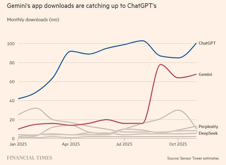 市场数据显示,Google正在多个维度缩小与OpenAI的差距。据Sensor Tower数据,11月Gemini的月度下载量达到1.008亿次,而ChatGPT为6780万次。